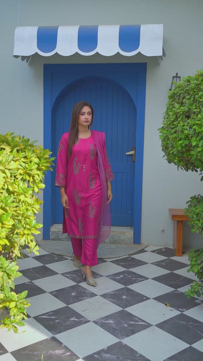 A royal vision of winter elegance — our Amber Noir 3PC in deep purple with golden embroidery is made to turn heads. Crafted from premium winter linen, this outfit radiates luxury and warmth. The rich hue paired with intricate golden threadwork adds a festive glow, making it perfect for formal evenings and special occasions.